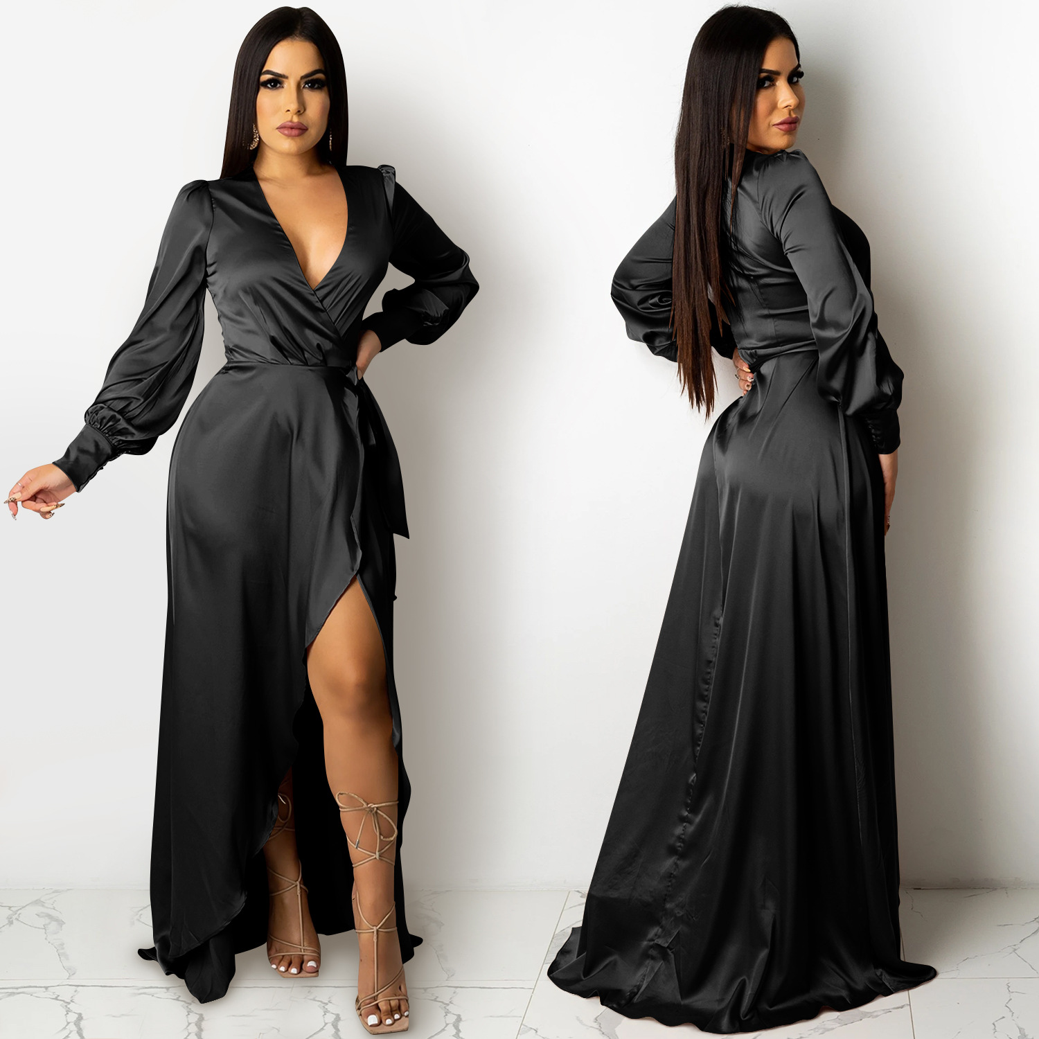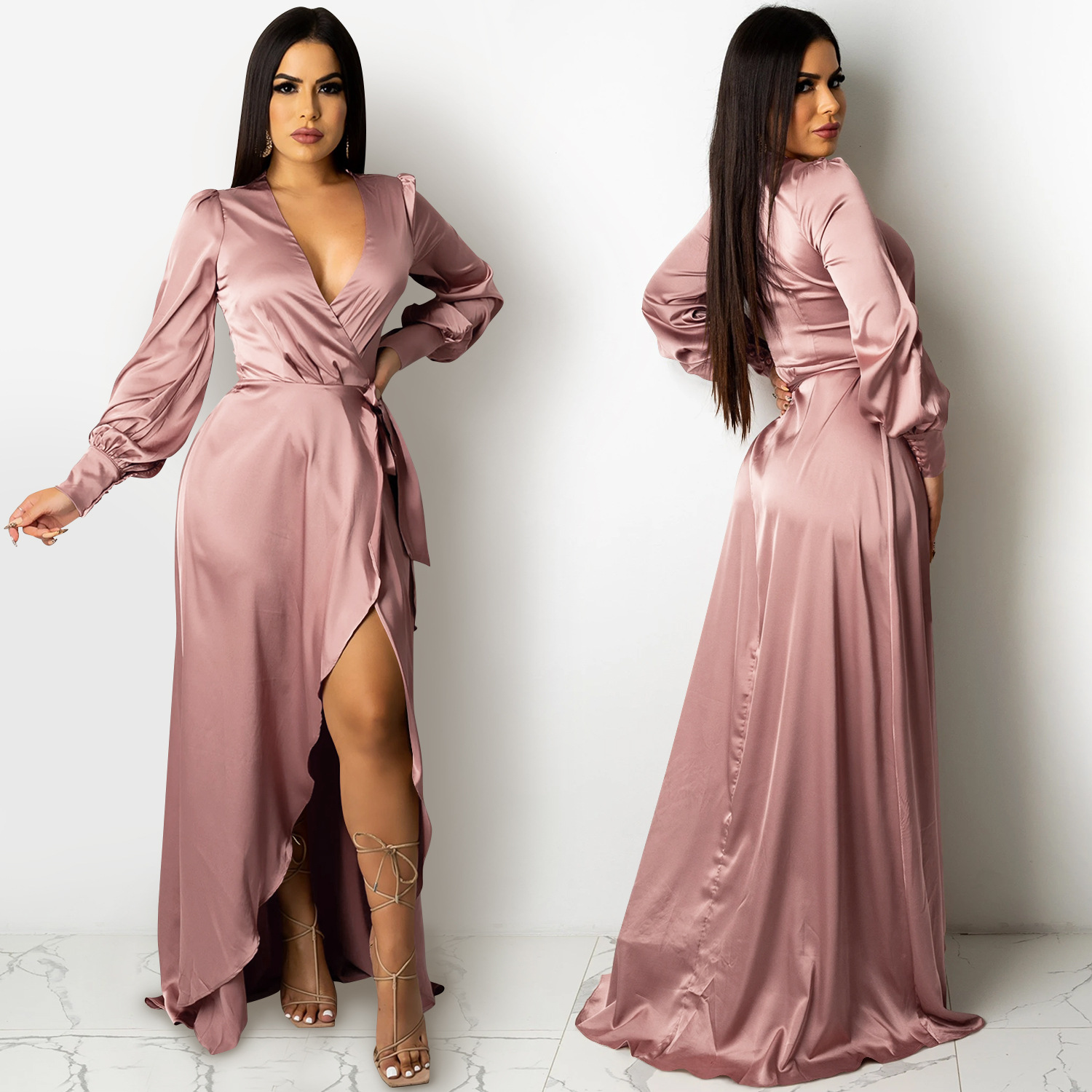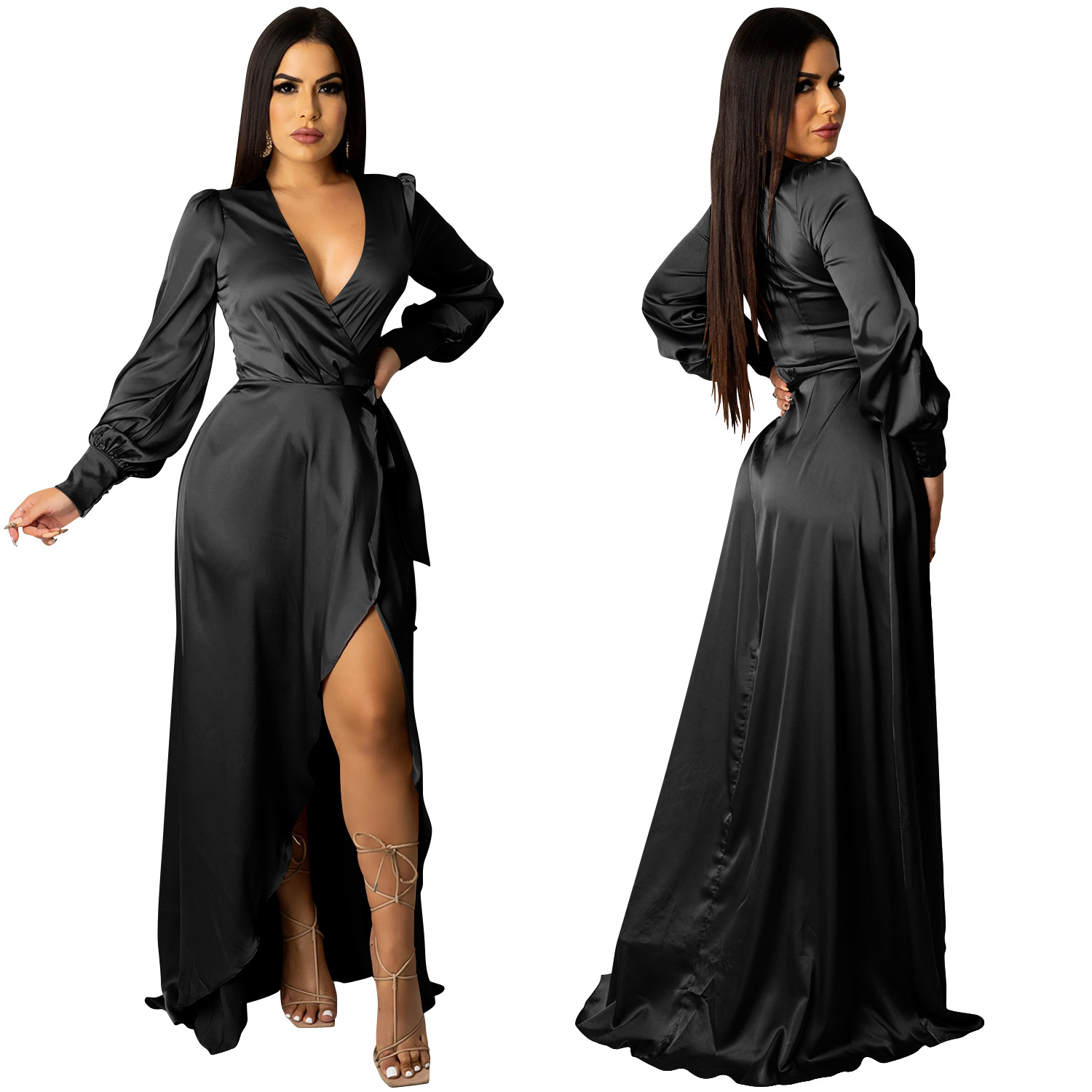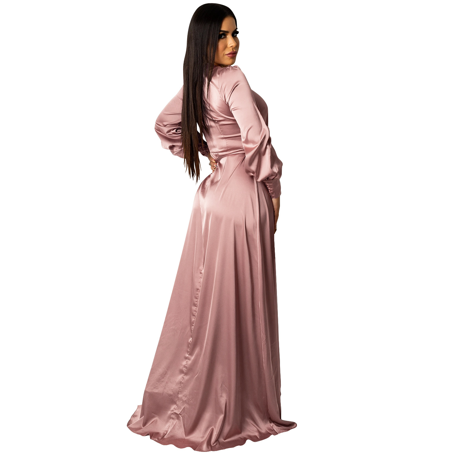 Fashion Sexy Solid Color Women's Deep V-Bandage Long Sleeve Split Maxi Dress