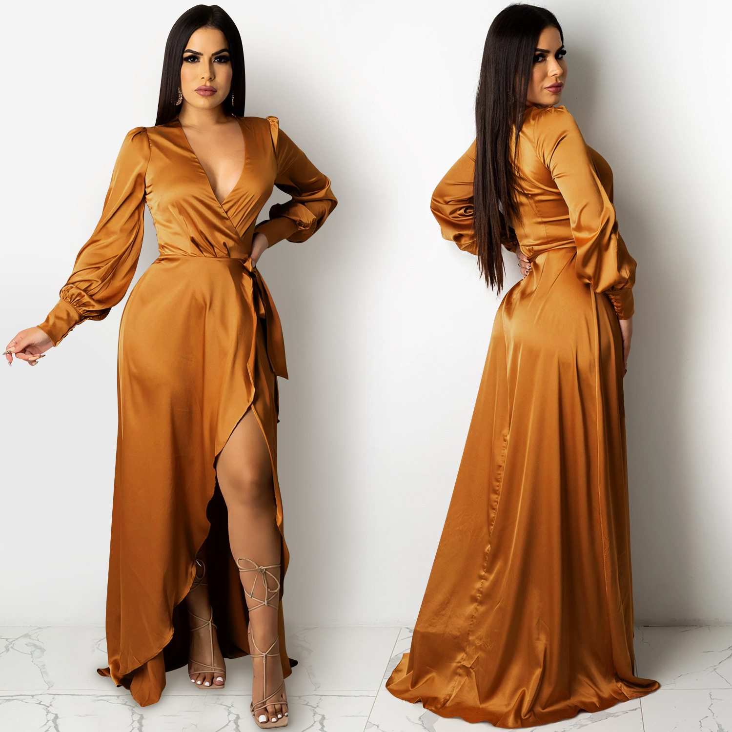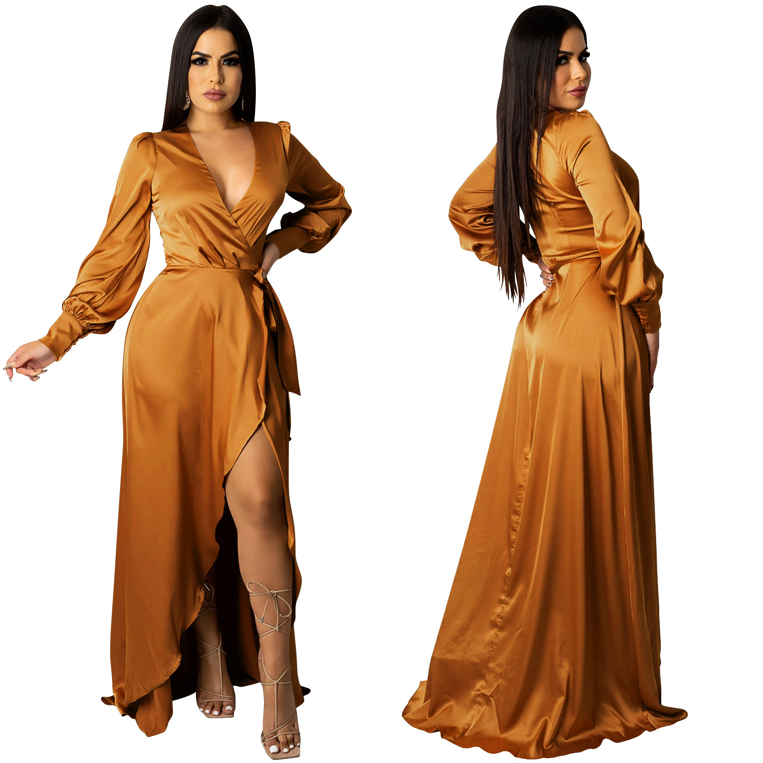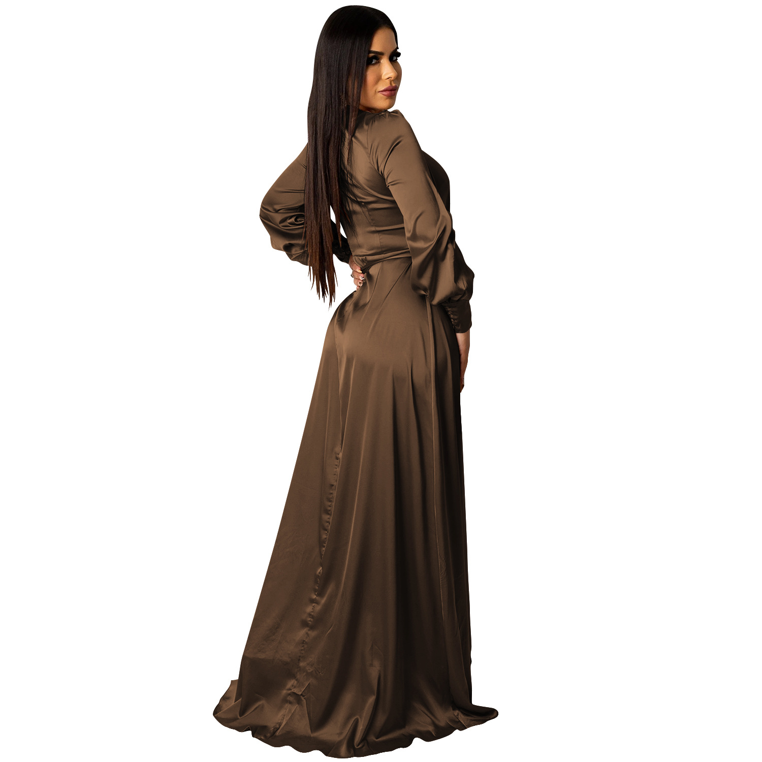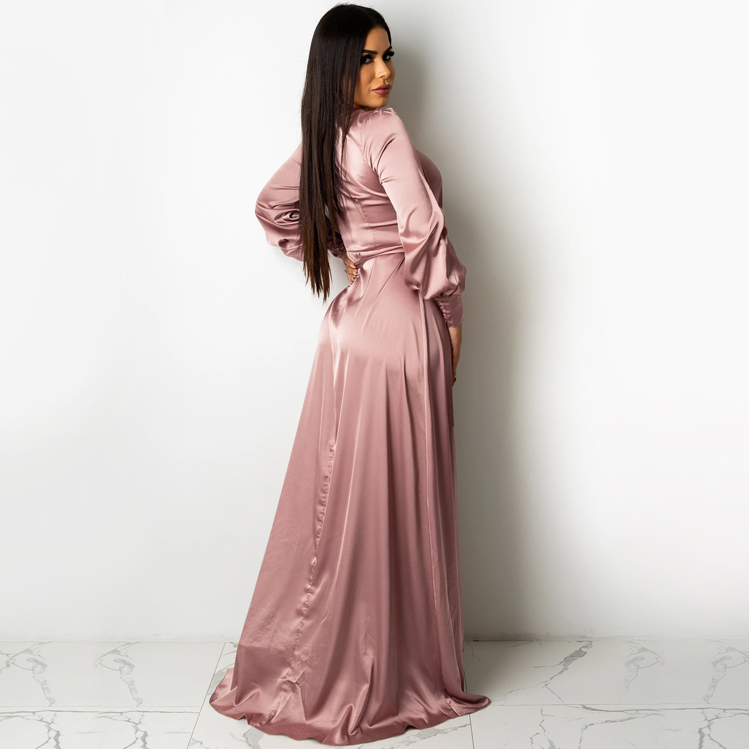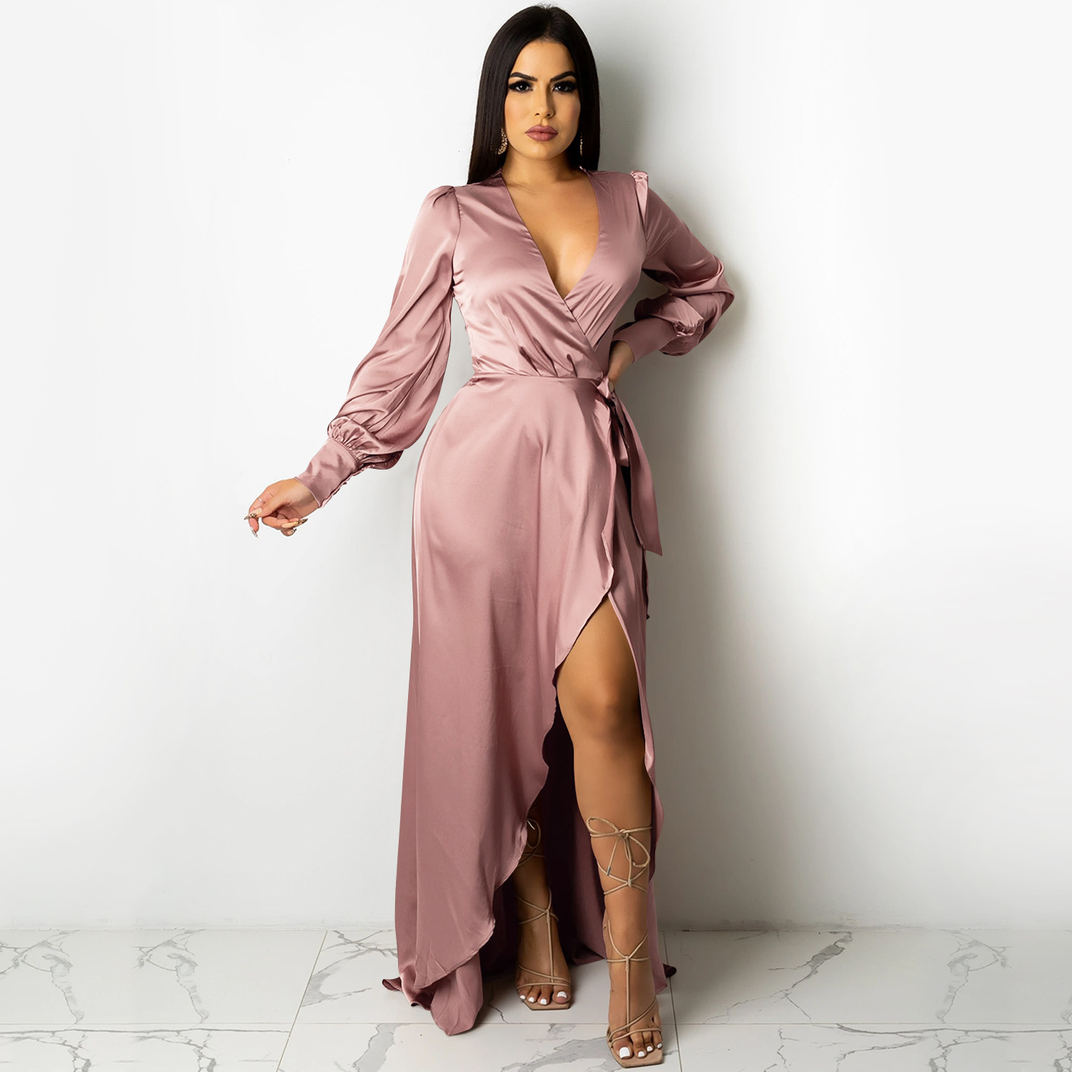 Fashion Sexy Solid Color Women's Deep V-Bandage Long Sleeve Split Maxi Dress
