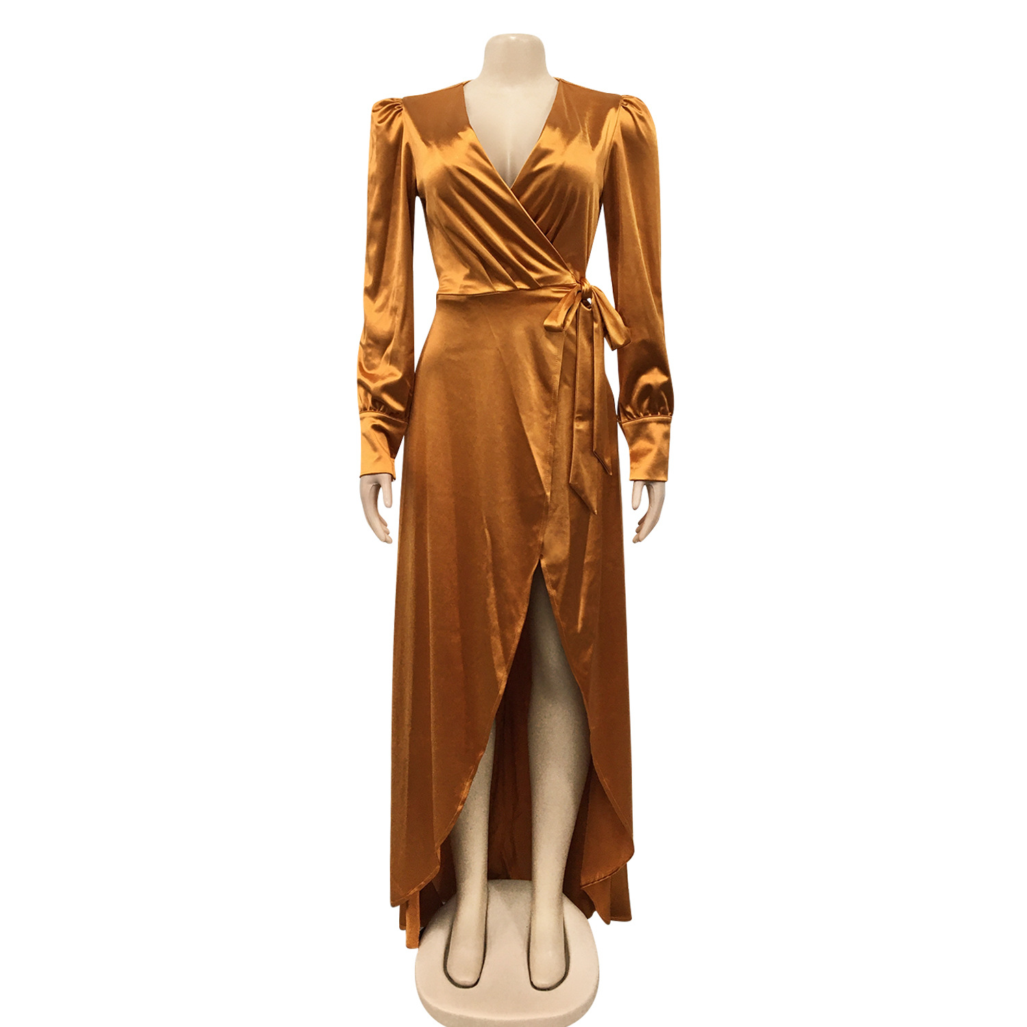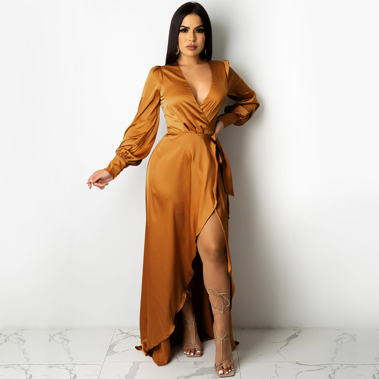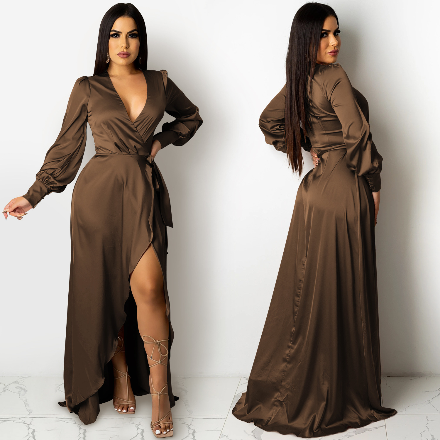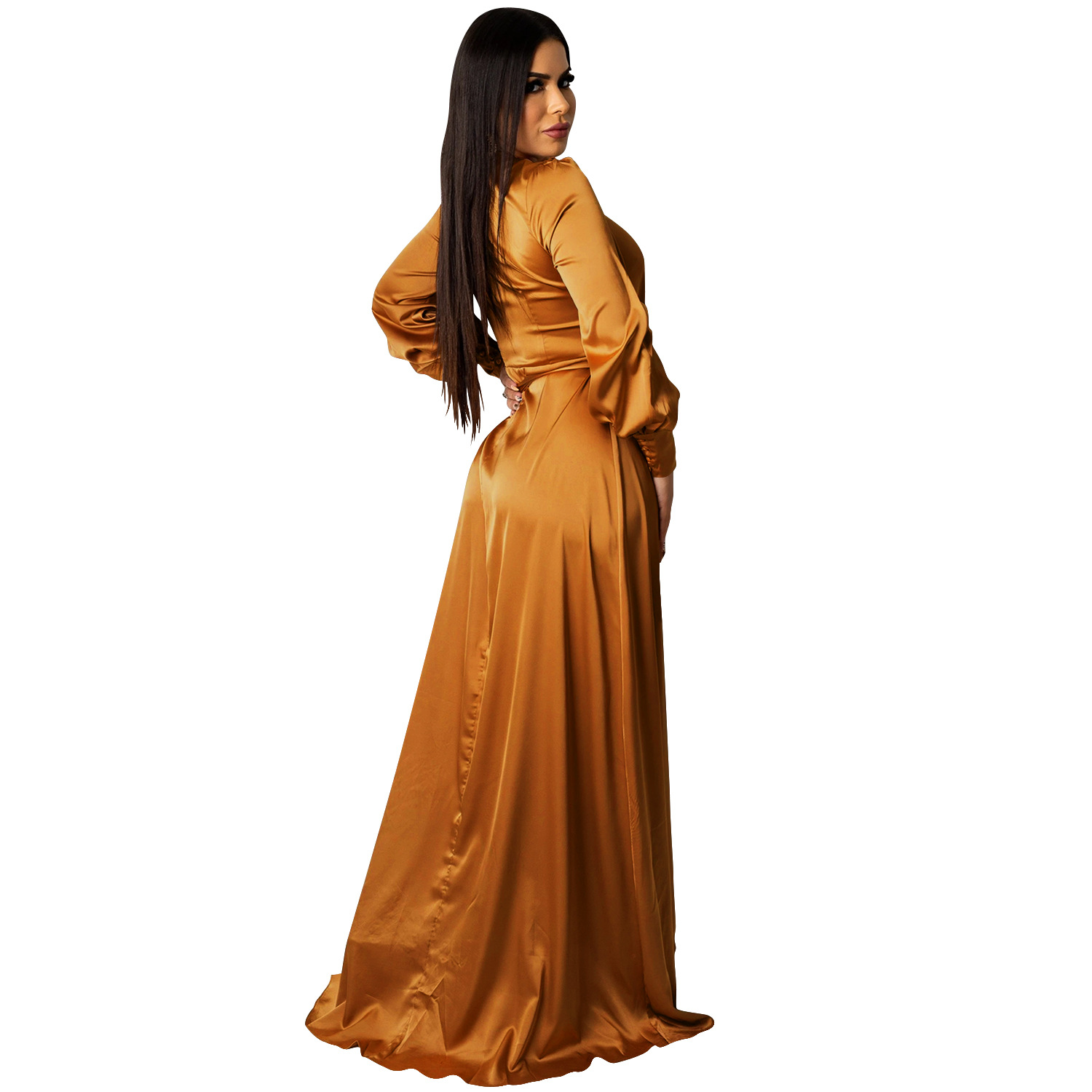 Fashion Sexy Solid Color Women's Deep V-Bandage Long Sleeve Split Maxi Dress